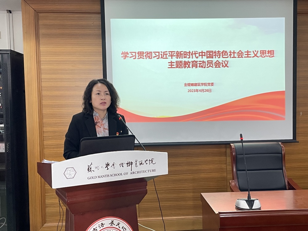 4月26日下午,金螳螂建筑学院党委在C01-1207会议室召开学习贯彻习近平新时代中国特色社会主义思想主题教育动员会议。学院领导班子成员、专职组织员、各党支部书记和委员、师生党员、发展对象等参加会议。学院党委副书记兼副院长成龙主持会议。