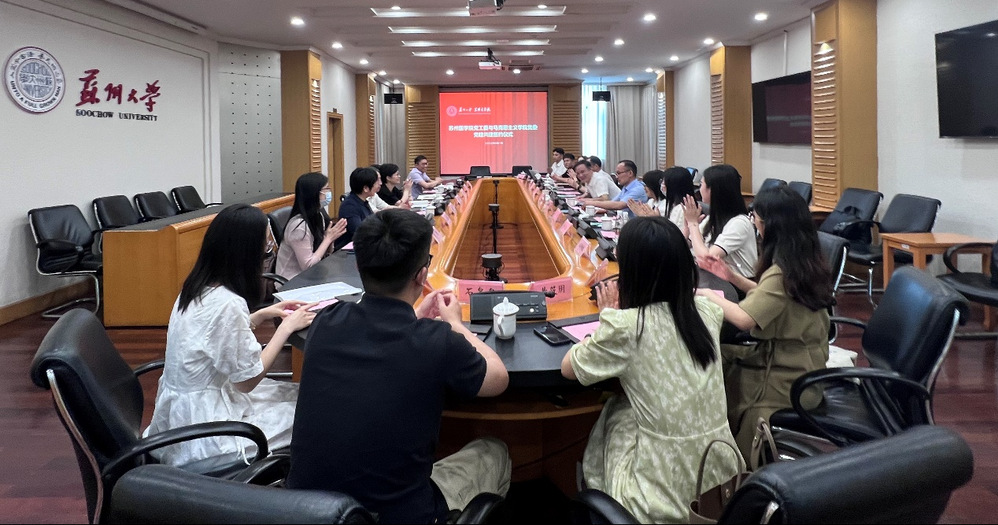 为了进一步学习贯彻习近平新时代中国特色社会主义思想,在以学铸魂、以学增智、以学正风、以学促干上取得实效,在学校党委研究生工作部和马克思主义学院党委的支持下,6月1日下午,苏州大学苏州医学院党工委与马克思主义学院党委举行党建共建签约仪式。苏州大学党委研究生工作部副部长、研究生院副院长徐维英,马克思主义学院党委书记陈建军、院长田芝健、副院长茆汉成、副院长朱蓉蓉、院长助理孔川、军事理论教研室党支部书记李瑾,苏州医学院党工委书记钱福良、副书记吴德建、专职组织员朱尧兴以及研究生专职辅导员出席会议。会议由吴德建主持。