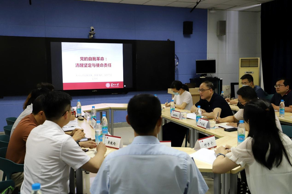 宫向阳以《党的自我革命:清醒坚定与使命责任》为题,紧紧围绕学习贯彻习近平新时代中国特色社会主义思想主题教育的总要求,从“推进党的自我革命的历史逻辑”“推进党的自我革命的现实逻辑”“推进党的自我革命的高校责任”三个方面展开,回顾了党的三个历史决议,从历史纬度解读党的自我革命是跳出治乱兴衰历史周期律的答案,并以“六个如何始终”概括了立足新时代我们保持自我革命的清醒和自觉的必要性,最后指出高校作为培养社会主义建设者和接班人的重要阵地,要把学习贯彻习近平新时代中国特色社会主义思想作为首要的政治任务,坚持和加强党对高校的领导,发挥党委的主体责任,以作风建设为重要抓手,加强党员干部特别是年轻干部的教育管理,敢于斗争、善于斗争,以自我革命的精神推动高校全面从严治党迈上新的台阶,为学校高质量发展提供强有力的政治保障,将推进自我革命落实到“立德树人”的根本任务和“为党育人、为国育才”的使命担当上去。
